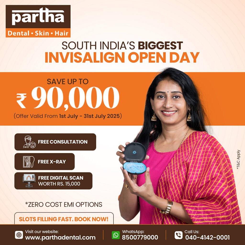 Just call or chat with Partha Dental to book your appointment instantly, or walk into your nearest branch in Hyderabad, Chennai, or Bangalore. Slots are limited, so book early and don’t miss out!